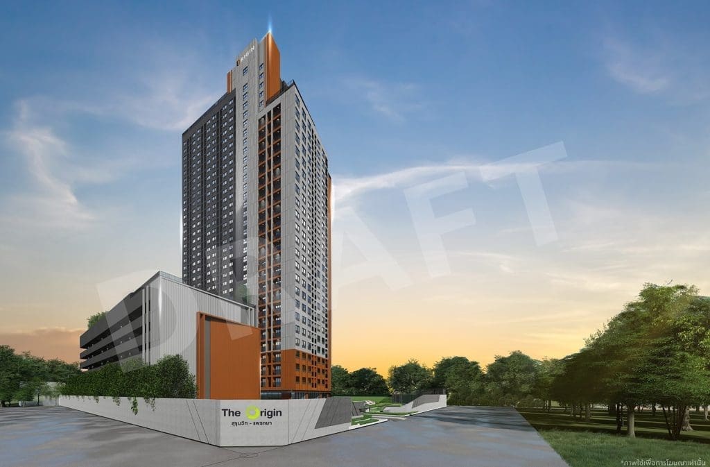 ‘ดิ ออริจิ้น สุขุมวิท-แพรกษา‘ พัฒนาโครงการเป็นคอนโด High-Rise 35 ชั้น + 1 ชั้นดาดฟ้า จำนวน 1 อาคาร มีห้องชุดพักอาศัย 823 ยูนิต และร้านค้าหน้าโครงการอีก 4 ยูนิต รวมทั้งโครงการมี 827 ยูนิต มีอาคารจอดรถ 8 ชั้น แยกออกมา 1 อาคาร โดยจะจอดรถได้ประมาณ 273 คัน* หรือคิดเป็น 40%* ของจำนวนยูนิต มีห้องพักให้เลือก 3 แบบ ได้แก่ 1 Bedroom 24 ตร.ม., 1 Bedroom 26 ตร.ม. และ 1 Bedroom Plus 32 ตร.ม.