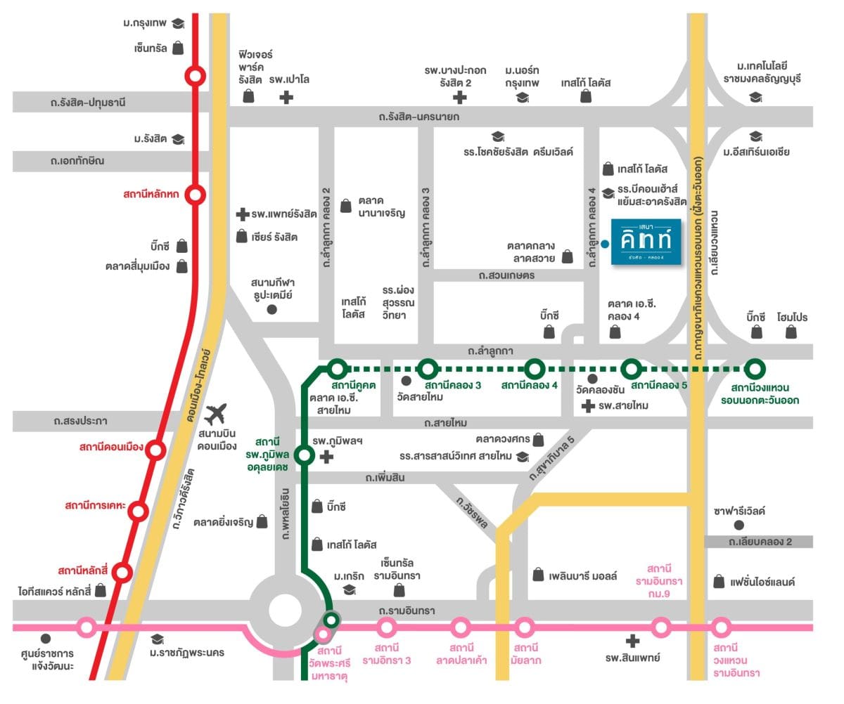 ทั้งยังเป็นโครงการที่อยู่ใกล้กับ แนวรถไฟฟ้าสายสีเขียว ช่วงหมอชิต-สะพานใหม่-คูคต โดยจะใกล้กับสถานีคูคต เพียง 15- นาที* สามารถนั่งเข้าเมืองไปทำงาน เรียนหนังสือ เดินเล่น Shopping ห้างใหญ่ในเมือง หรือจะใช้นั่งไปเปลี่ยนรถไฟฟ้าสายอื่น ๆ ก็ทำได้ง่ายแบบไร้รอยต่อ และในอนาคตจะมีส่วนต่อขยาย สถานีคลอง 4 เพิ่มเข้ามา โดยตัวสถานีจะตั้งอยู่ที่หน้าปากซอยถนนลำลูกกา ซึ่งจะทำให้เดินทางโดยรถไฟฟ้าเป็นเรื่องง่ายมากขึ้น