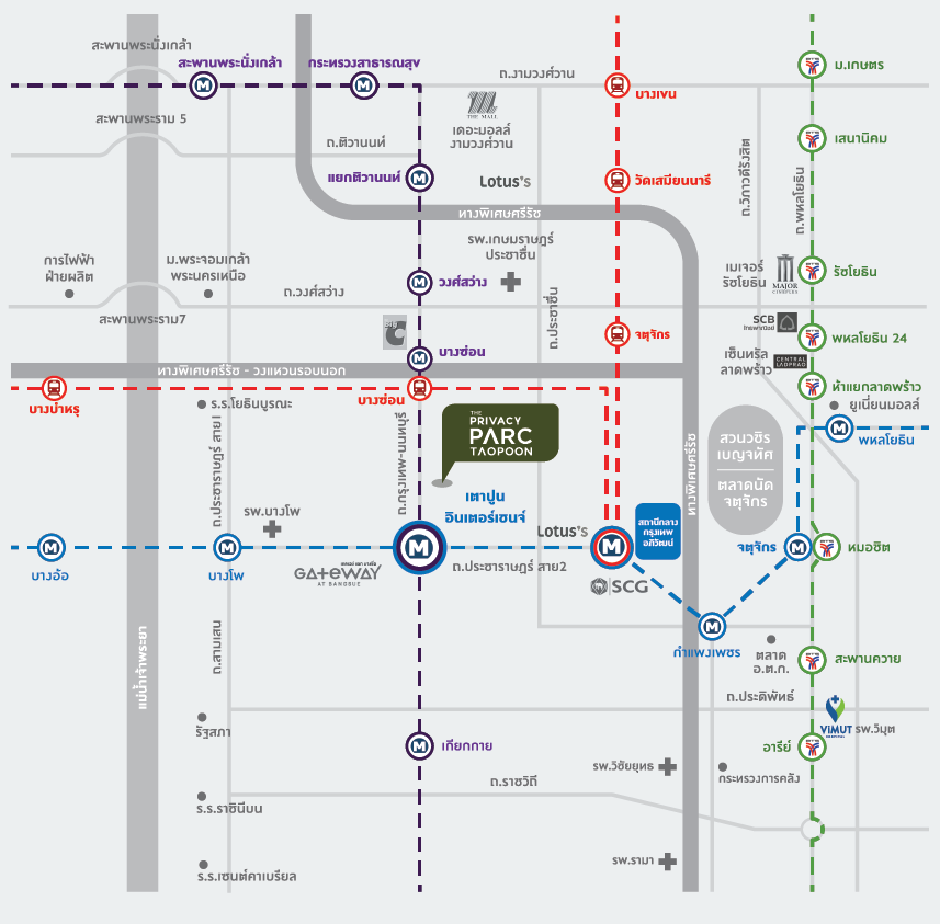 The Privacy Parc Taopoon คอนโดใหม่ล่าสุดจาก พฤกษา เรียลเอสเตท โครงการที่มีความคุ้มค่า ทั้งการอยู่อาศัย และการลงทุนปล่อยเช่าที่ได้ผลตอบแทนที่ดีในระยะยาว เนื่องจากเป็นโครงการที่อยู่ติดถนนใหญ่ ถนนกรุงเทพ-นนทบุรี ใกล้ MRT เตาปูน อินเตอร์เชนจ์ เพียง 500 ม.* ซึ่งเป็นสถานีที่เชื่อมต่อระหว่างรถไฟฟ้าสายสีม่วงและรถไฟฟ้าสายสีน้ำเงิน